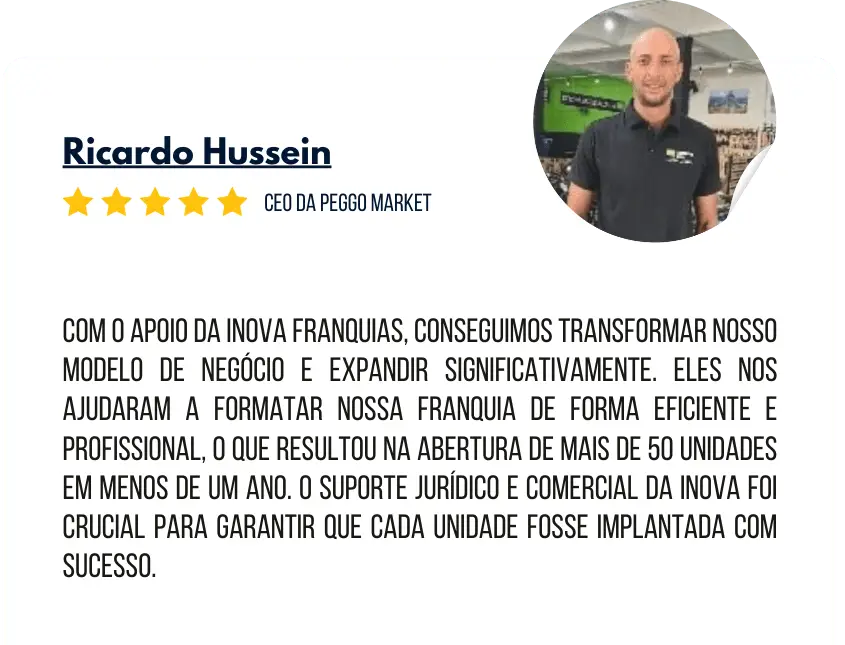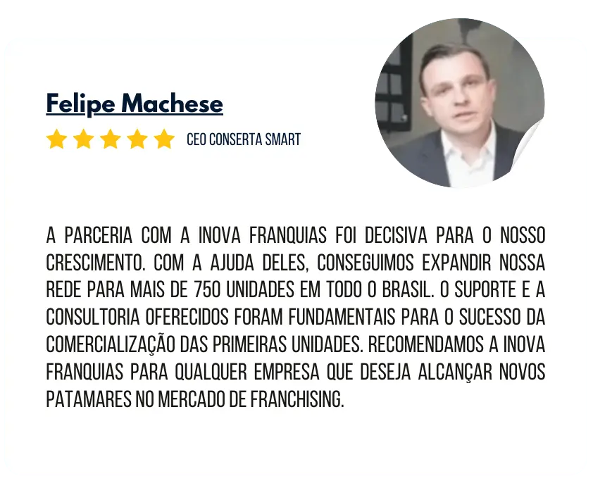 O processo de transformar seu negócio em uma franquia pode variar dependendo da complexidade do modelo e do mercado-alvo. Na Inova Franquias, nosso compromisso é com a eficiência e a qualidade. Normalmente, conseguimos concluir a formatação do seu negócio em franquia em 3 a 6 meses, com suporte contínuo para garantir uma transição suave e bem-sucedida.
